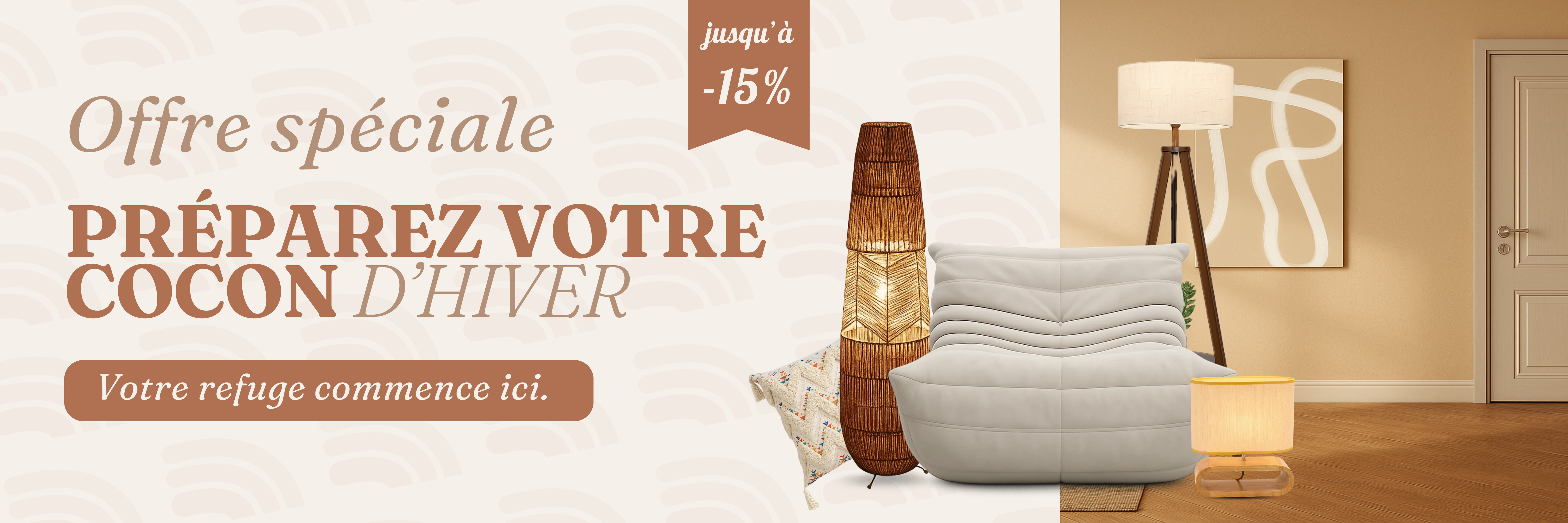 Le but ? Voyager tout en restant chez soi. Des éléments du monde entier s’unissent pour vous offrir une ambiance bohème chaleureuse et naturelle : tapis tressés, luminaires en fibres végétales, meubles en bois et accessoires authentiques.